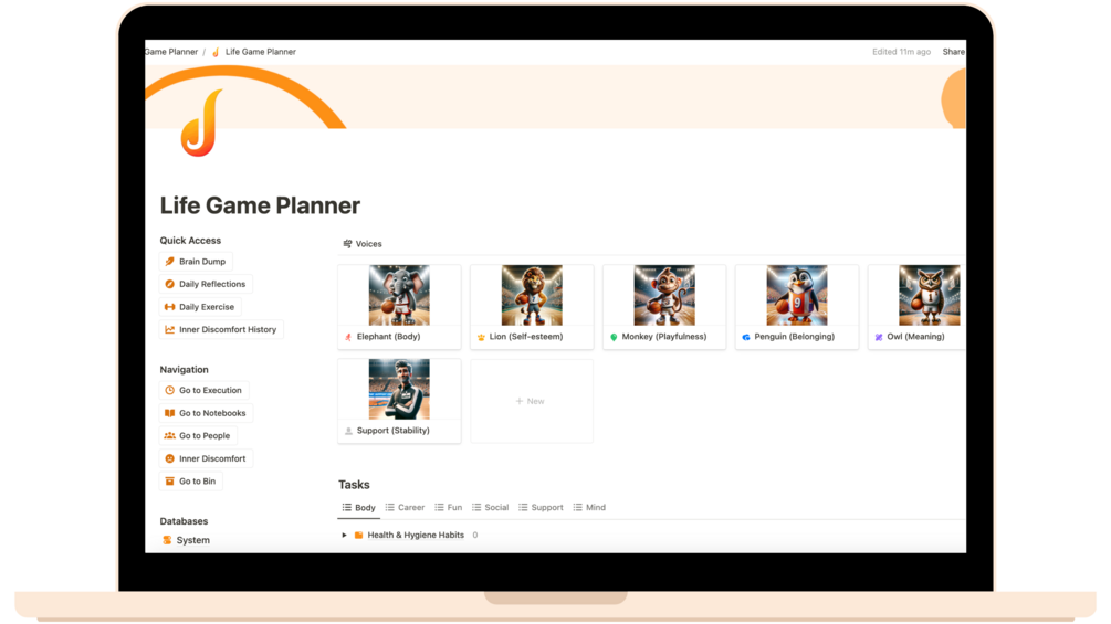 • Holistic Life Management: Integrates all aspects of your life through a unique conceptual framework based on the 5 fundamental needs or Inner Voices: Body (Elephant), Self Esteem (Lion), Playfulness (Monkey), Belongingness (Penguin), and Meaning (Owl).