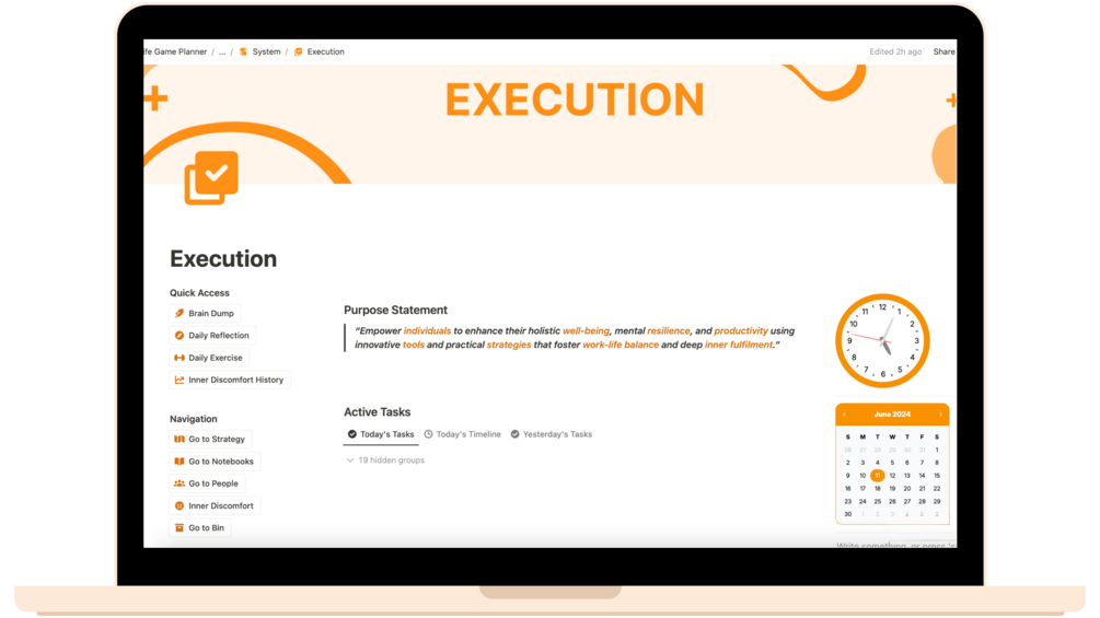 • Execution: Focus daily with a curated list of tasks, keeping you aligned and mindful of your immediate priorities.